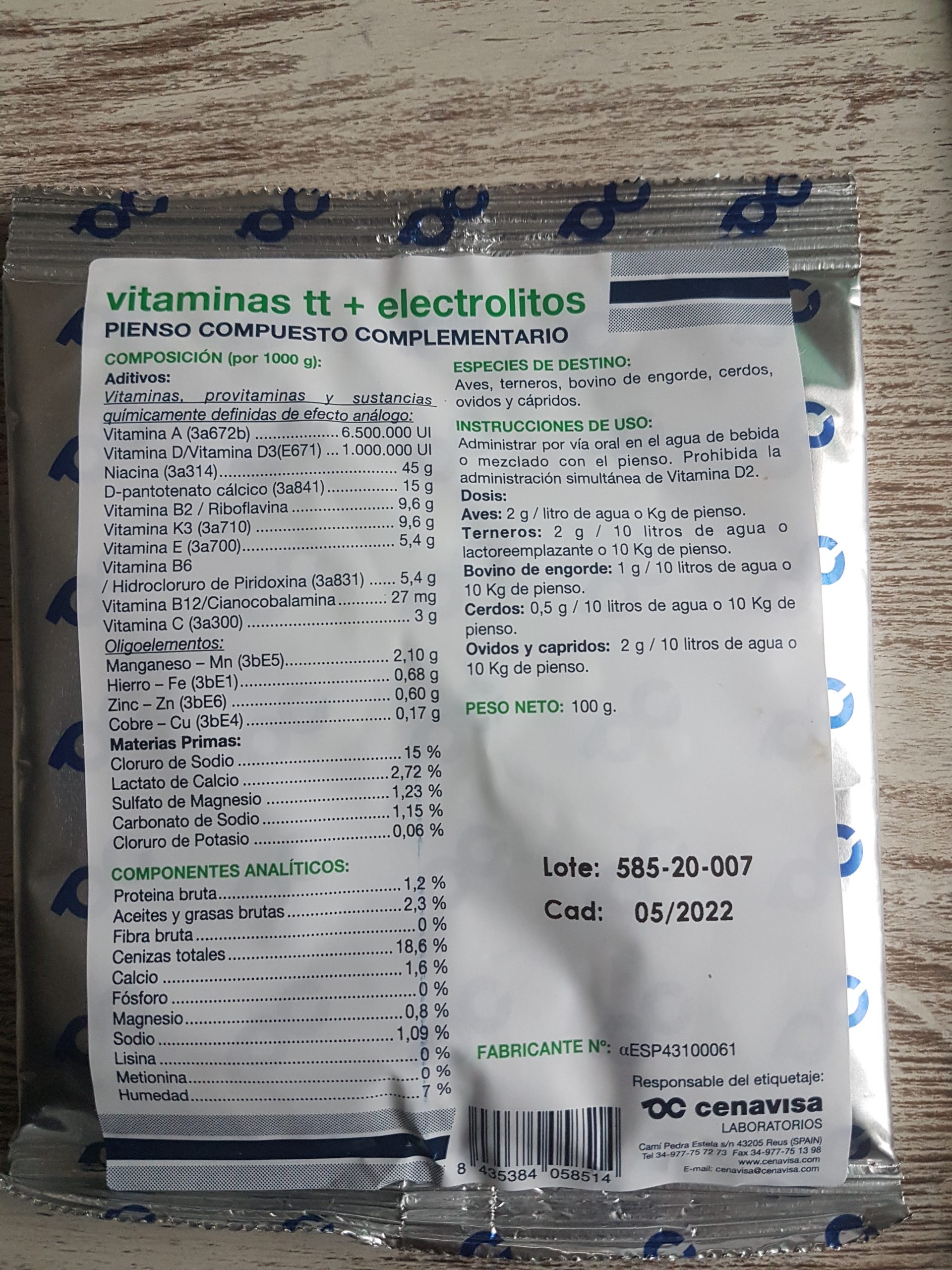 VITAMINAS TT + ELECTROLITOS polvo oral hidrosoluble es ideal para tratar la falta de vitaminas y periodos de convalecencia en las aves (canarios, periquitos, jilgueros, gallinas, pollos, perdices, ovejas, cabras, caballos….). Su composición es alta en vitaminas, aminoácidos y minerales.