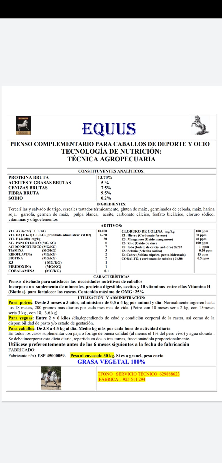 Para potros de más de dos años yeguas gestantes o vacías y caballos con cualquier tipo de actividad, modulando consumo entre 3.5 y 4.5 kg dia; lo normal en caballos son 4 kg en caballos en ligera actividad. Si son caballos de competición pueden ser unos 6 kg de cualquiera de uno de los dos pienso